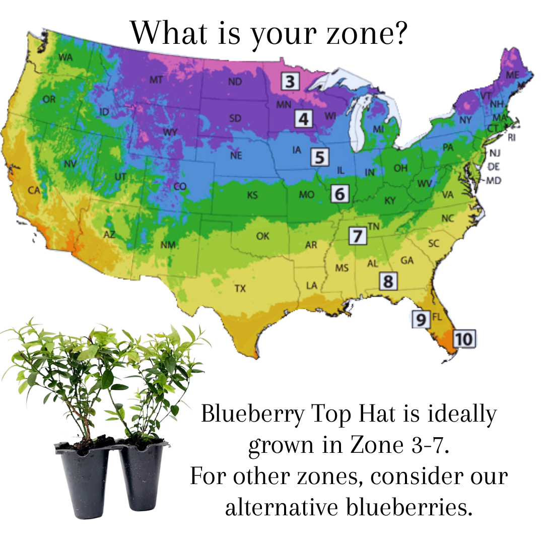 The Top Hat is a blueberry perfect for small space gardens, patios, balconies, or even indoor container gardening. But don’t let this blueberry’s diminutive size fool you because it delivers blueberries that are just as large and that pack just as much flavor as traditional-sized blueberry shrubs.